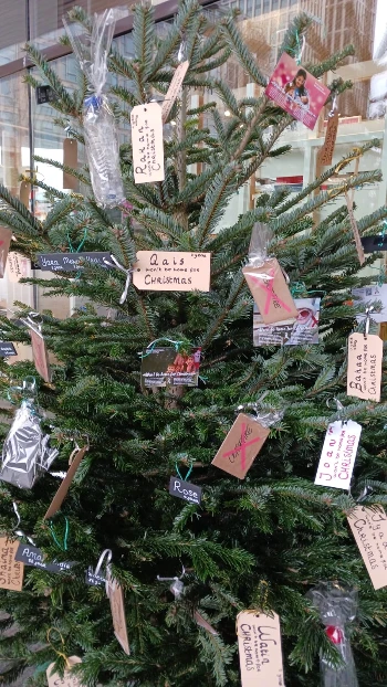Dec 2023: They Have Names postcards in a Christmas tree in Rotterdam