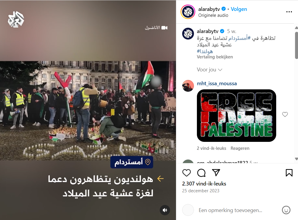 24 Dec 2024: On Christmas Eve a candlelightaction at Dam Square. Al Araby TV reports, including all the banners.