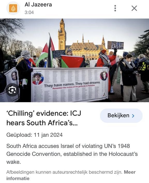 11 Jan 2024: ICJ hearing in South Africa's genocide case against Israel. Reported by Al Jazeera.